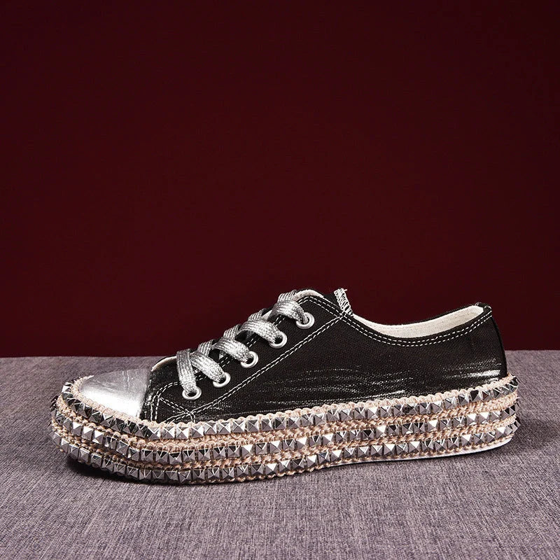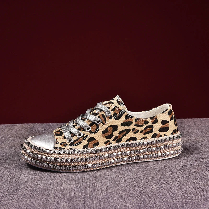 Step up your style game with these Platform Trainers – where edgy meets chic. Designed to make a bold statement, these low-top sneakers combine a fierce leopard print or sleek black canvas with glittery laces and a striking studded platform sole.