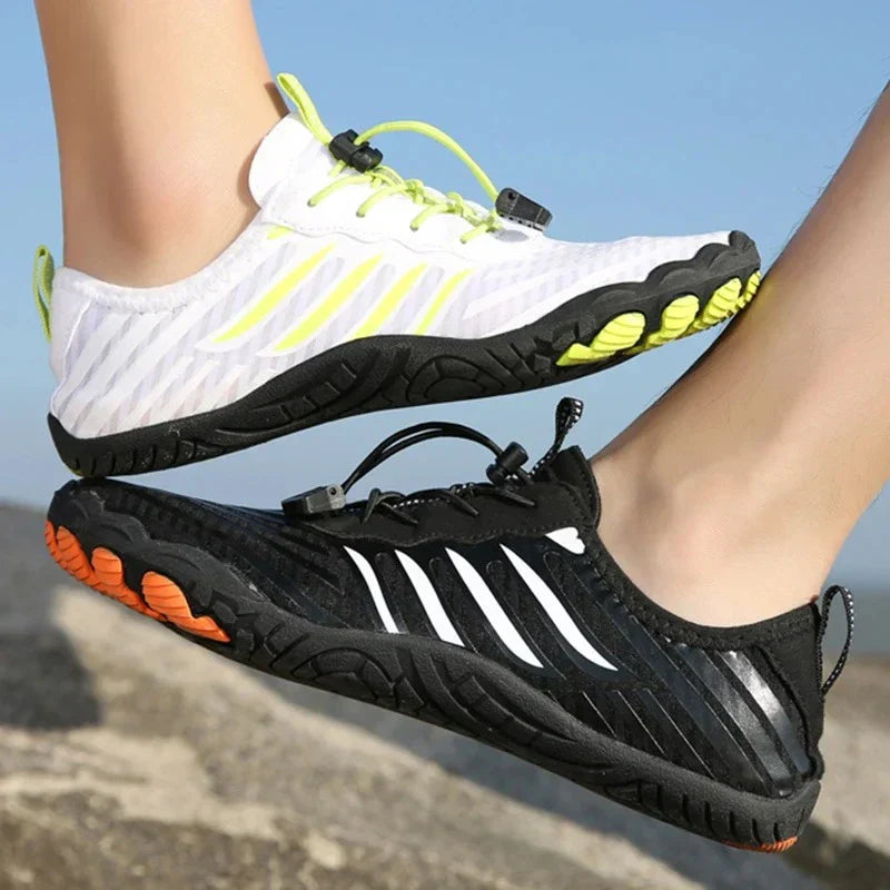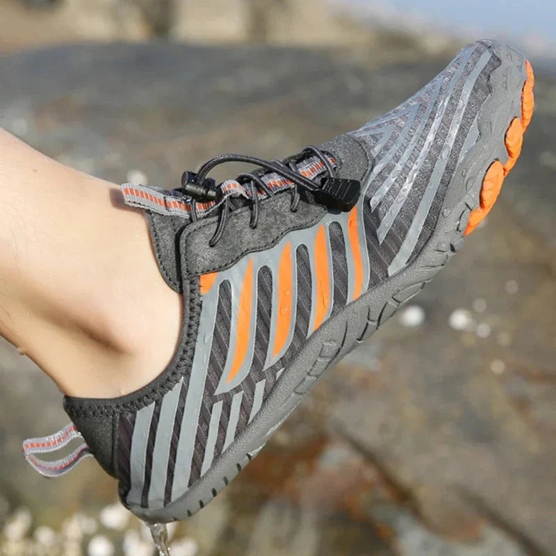 A thick rubber sole with drainage holes to keep your feet dry and provide reliable grip on all terrains.
